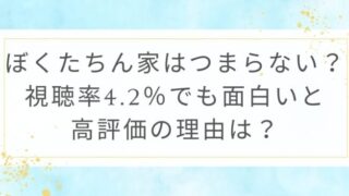 ドラマ ぼくたちん家はつまらない?視聴率4.2%でも面白いと高評価の理由は? ドラマ『ぼくたちん家』が「つまらない」と言われる理由や、視聴率4.2%でも高評価を得ている背景を徹底解説。及川光博さんや手越祐也さんの演技、温かいストーリーが評価される理由を詳しくまとめ、口コミや視聴率ランキング比較もしながら、ドラマの魅力を余すことなく紹介します。 2025.10.21 ドラマ